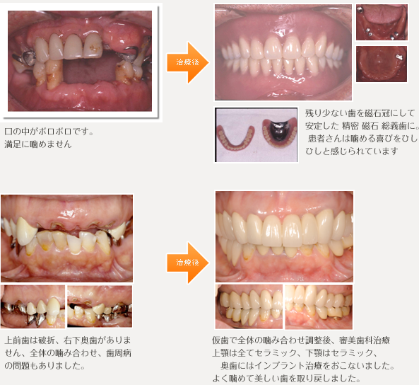 歯周病のコントロールから始め、噛み合わせ治療、再生治療、インプラント、精密義歯、磁石義歯、審美歯科治療など、最新高度な治療を駆使して快適な状態を回復することが可能です。