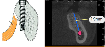 CT断層撮影では下顎管までの距離は19㎜、インプラント治療には十分な長さです。しかし、骨の断面は傾斜してえぐれているのが解ります。骨を突き抜けると大変です