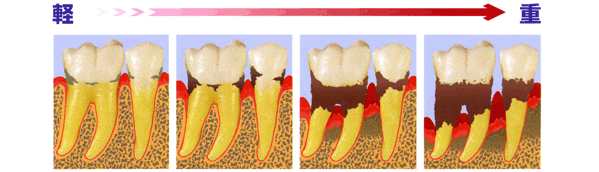 歯周病は歯を支える骨がじわじわと溶ける病気です。大きな痛みもなくこの病気は進行していきます。歯ぐきからの出血、口臭くらいの自覚しかありません。歯の動き、歯ぐきの腫れ、痛みなどで、気がついた時は手後れの場合が全どです。 虫歯でないのに歯が抜けます。35歳以降のあなたは要注意です!