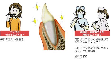 今ついている汚れ、歯石、歯ぐきからの出血等をなくす治療から始めます。慢性疾患だからその後の定期的な検診、治療が大切です。