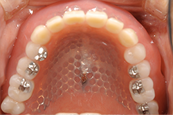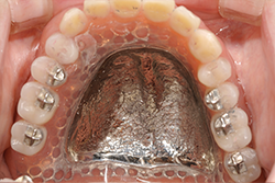 下顎の左右奥歯がありません、金属床義歯の補強のため左右各1本の歯を磁石加工しました。義歯のがたつきも少なくなり快適です。
